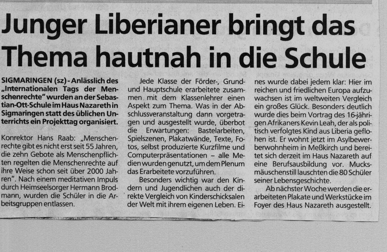 Am 10. Dezember 2003 befassten sich alle Schülerinnen und Schüler der Sebastian-Ott-Schule Sigmaringen mit dem Thema Menschenrechte. Hierzu erschien am 18.12. 2003 folgender Pressebericht in der Schwäbischen Zeitung.